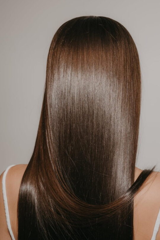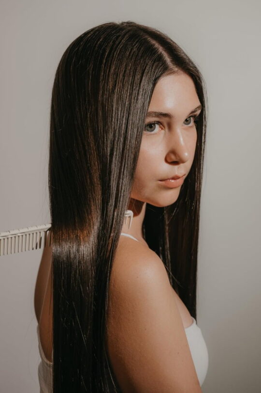 Po wyprostowaniu całych włosów nałóż nabłyszczający produkt – może to być lekki olejek, mgiełka lub serum z silikonami. Skup się na długościach i końcówkach. Unikaj aplikowania przy nasadzie – zbyt duża ilość produktu może obciążyć fryzurę.